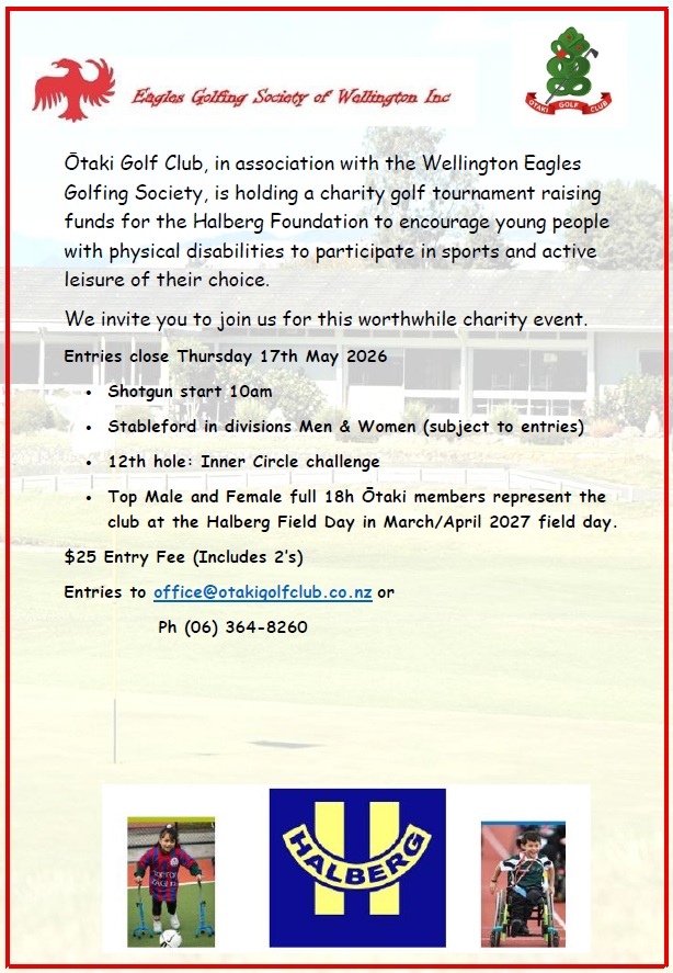 Ōtaki Golf Club, in association with the Wellington Eagles Golfing Society, is holding a charity golf tournament raising funds for the Halberg Foundation to encourage young people with physical disabilities to participate in sports and active leisure of their choice.