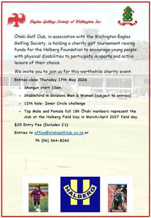 Ōtaki Golf Club, in association with the Wellington Eagles Golfing Society, is holding a charity golf tournament raising funds for the Halberg Foundation to encourage young people with physical disabilities to participate in sports and active leisure of their choice.